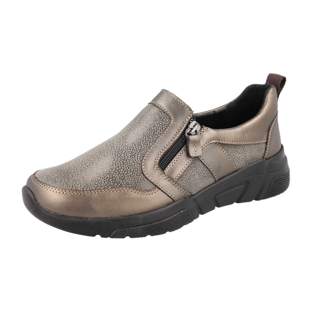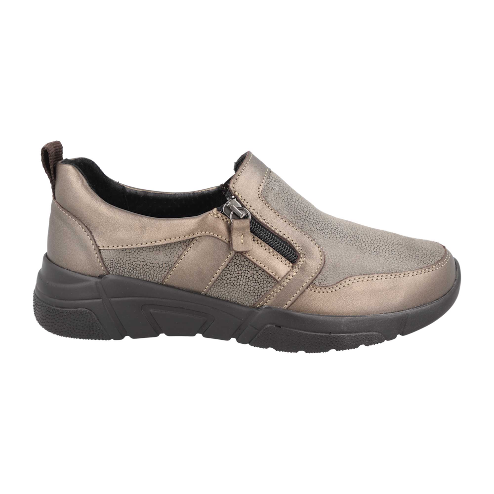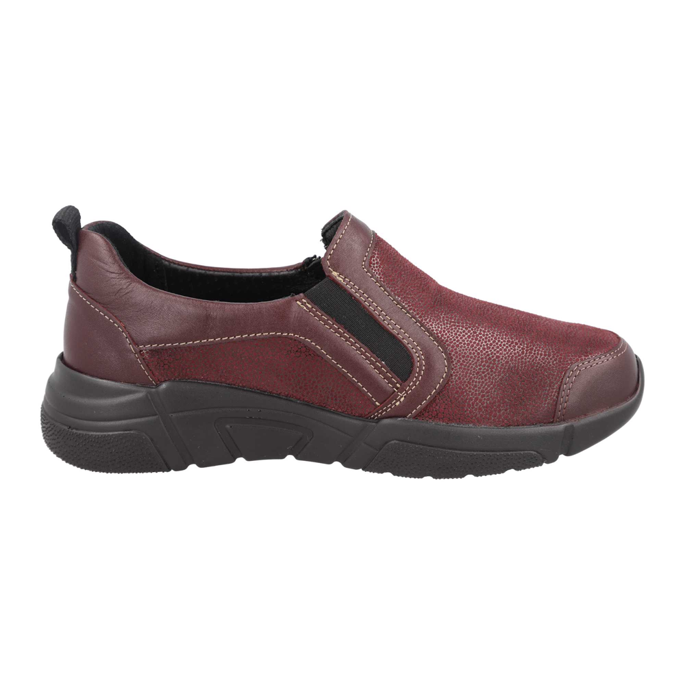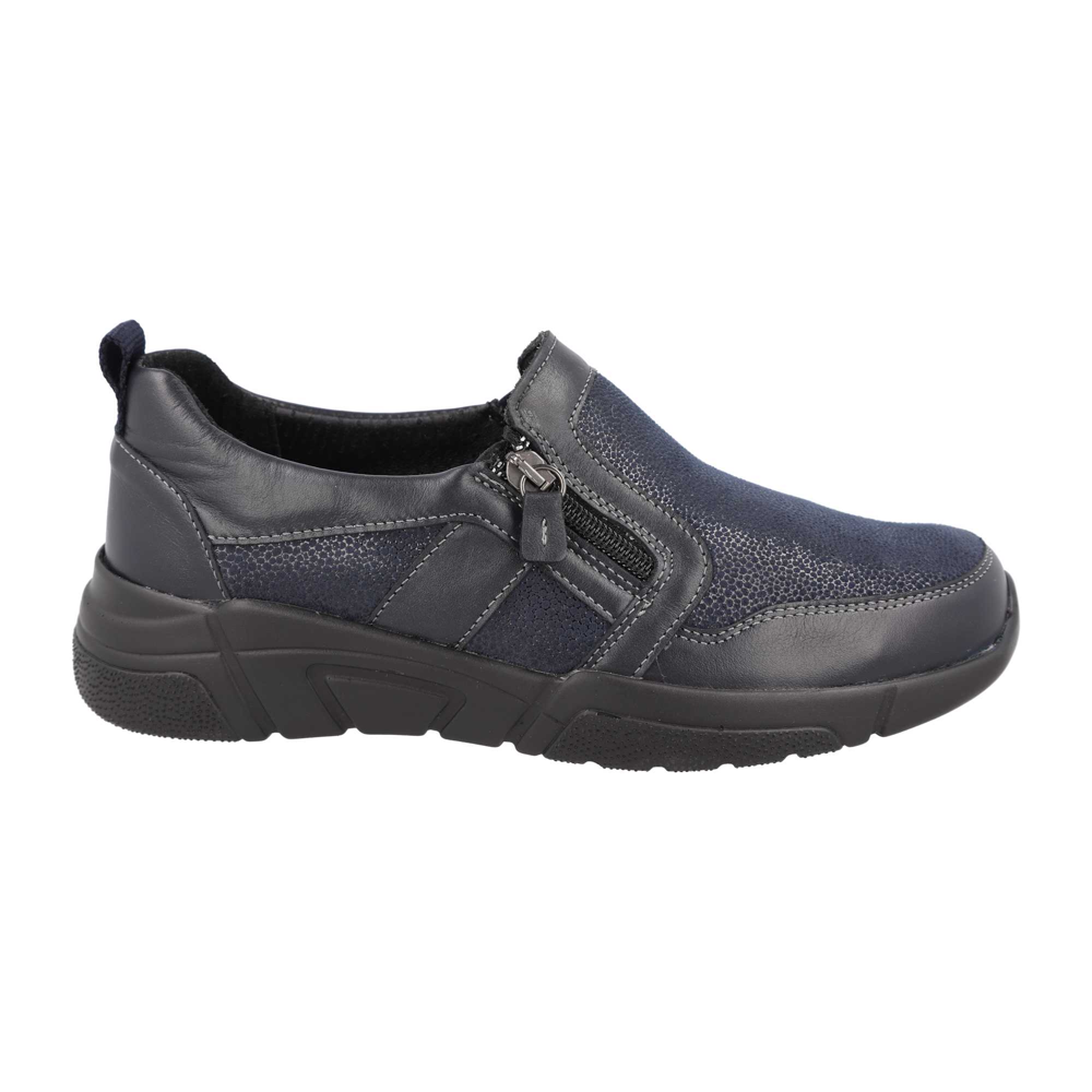 Sporty active leisure ladies leather shoe with side zip for easy of access. Stretch panels give day long comfort and adjustability. Super for everyday wear with a comfortable pu air bubble sole unit. Attractive and comfortable wedge sole unit.