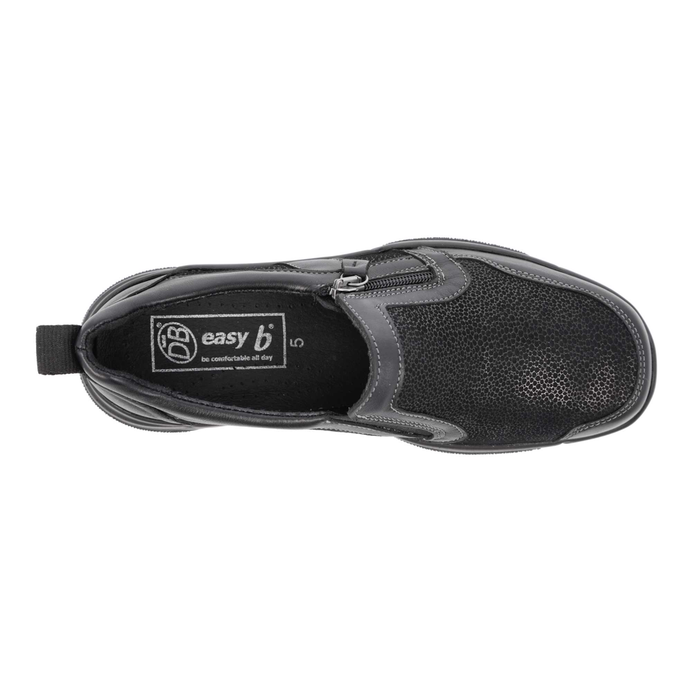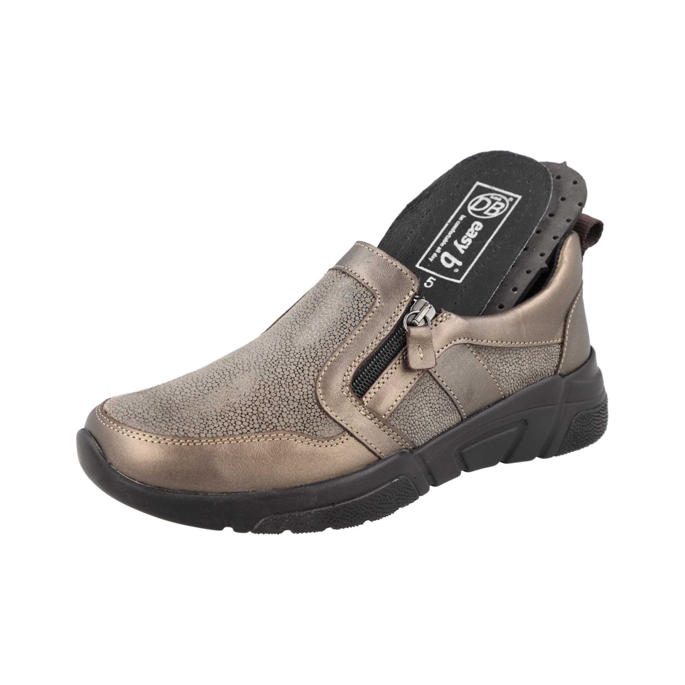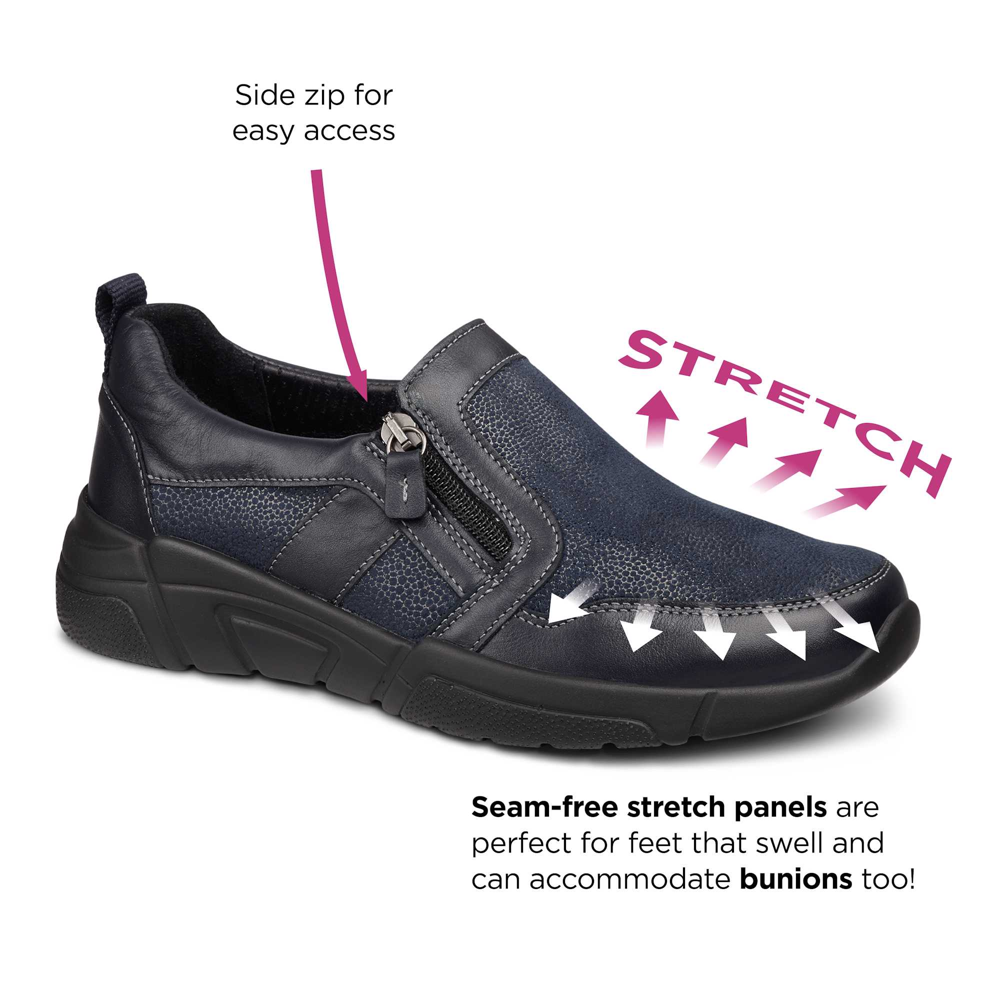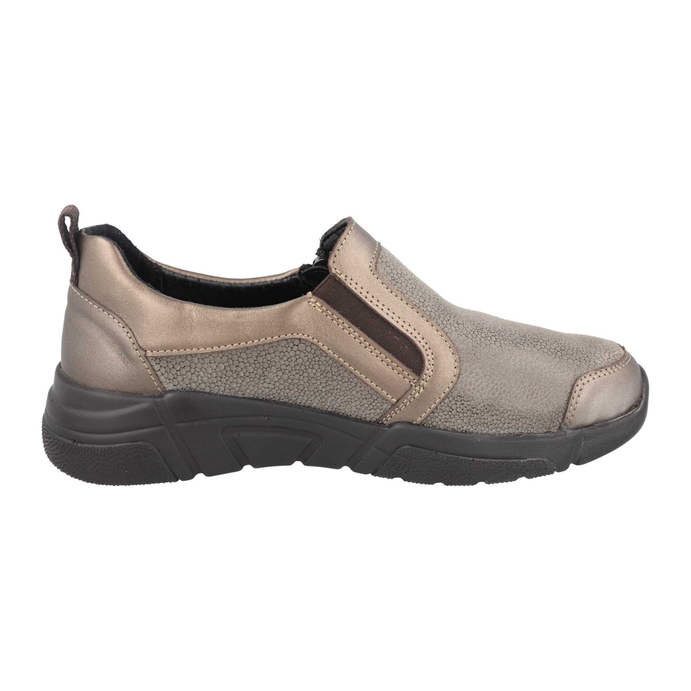 Sporty active leisure ladies leather shoe with side zip for easy of access. Stretch panels give day long comfort and adjustability. Super for everyday wear with a comfortable pu air bubble sole unit. Attractive and comfortable wedge sole unit.