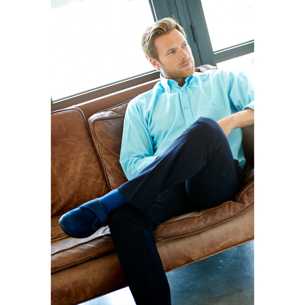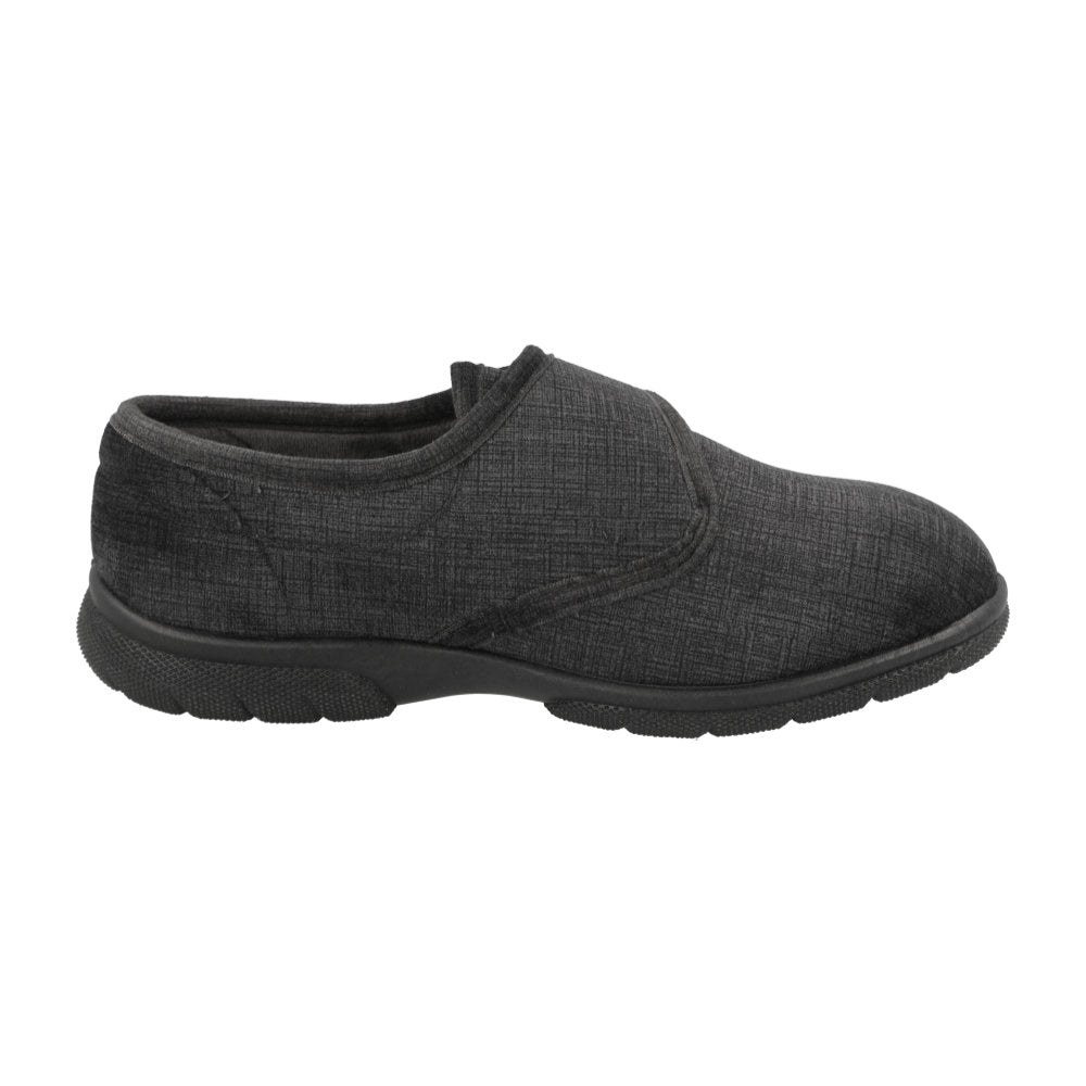 This traditional style of house shoe is designed for effortless on and off wearing, featuring adjustable touch straps to provide a supportive and customizable fit. It's the perfect choice for men looking for comfortable and secure slippers, especially those with a higher instep. The sleek black design adds a touch of sophistication to any loungewear ensemble.